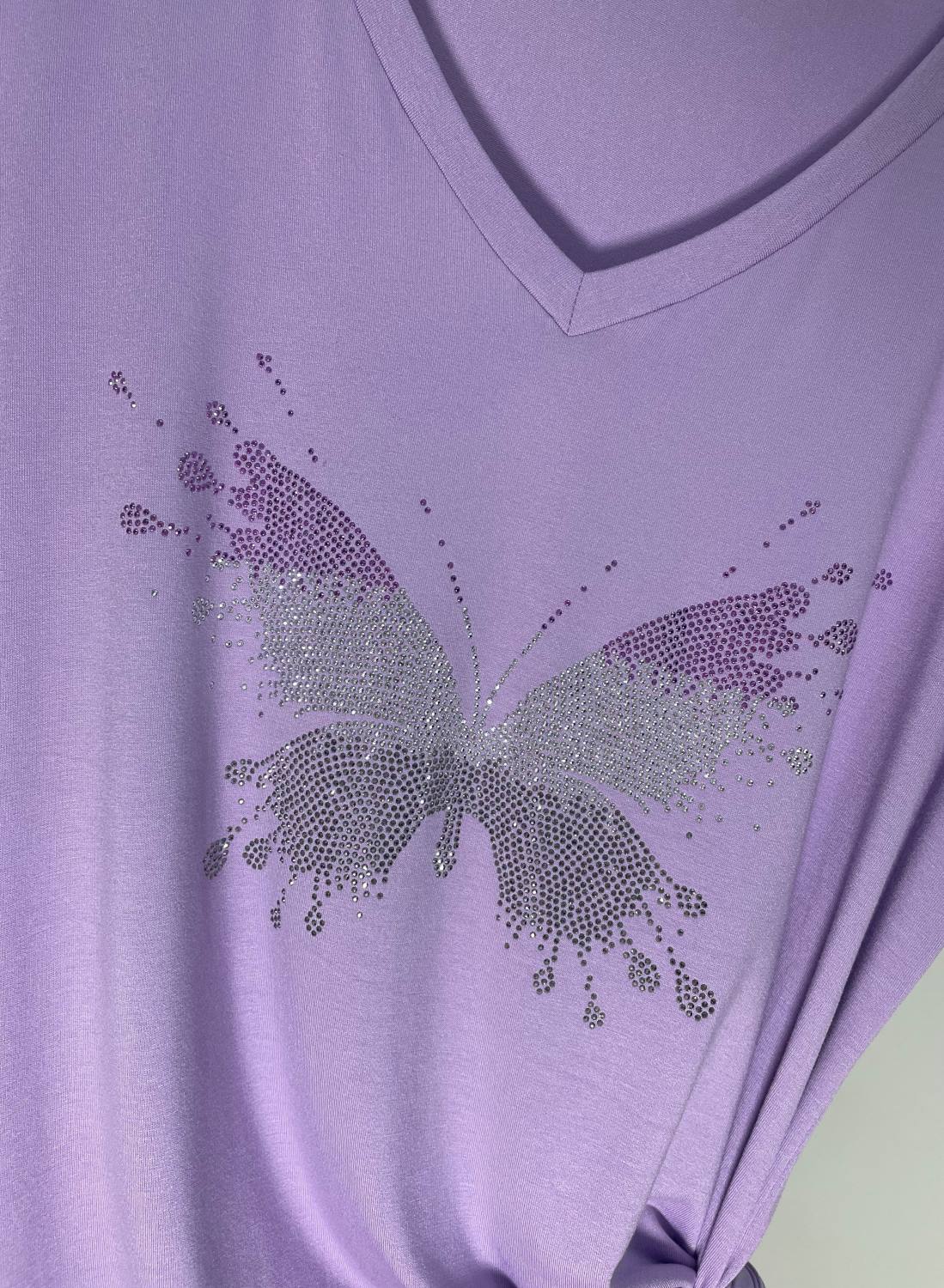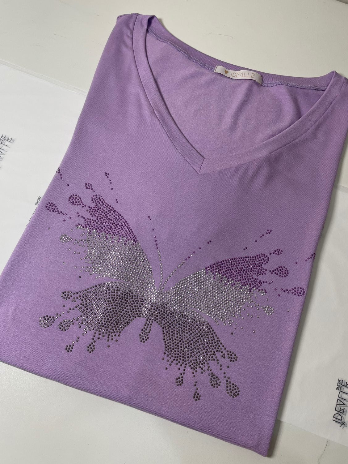Nossa T-Shirt Aquarela foi desenvolvida em uma mistura de borboleta com um pouco do abstrato, um estilo bem inspirador essa tee traz um mix de cores únicos e que dão a pecinha um ar diferenciado que você vai querer usar sempre. Perfeito para o dia a dia. Feito com pedraria super delicada em decote em V e cor lilás!