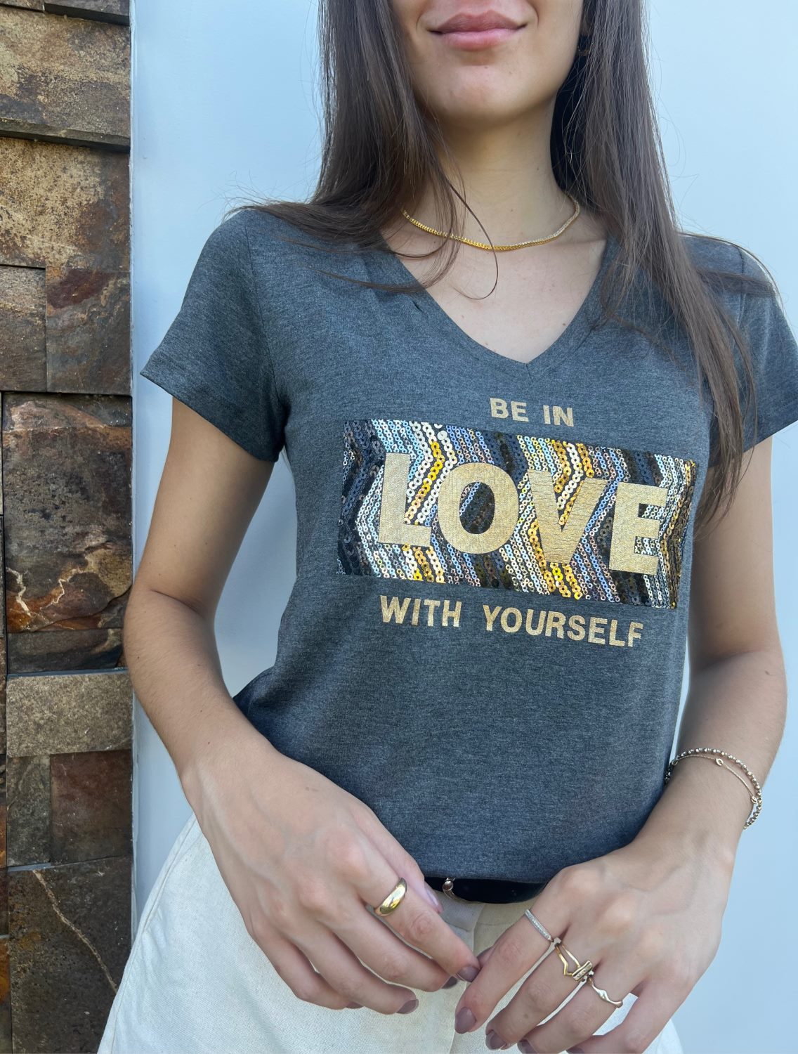 A T-Shirt Bali é desenvolvida por um conjunto de paetês coloridos bem diferenciadas, combinando o dourado, prata e preto com muita sutileza! Formando uma peça única. Disponível na cor cinza e decote em V.