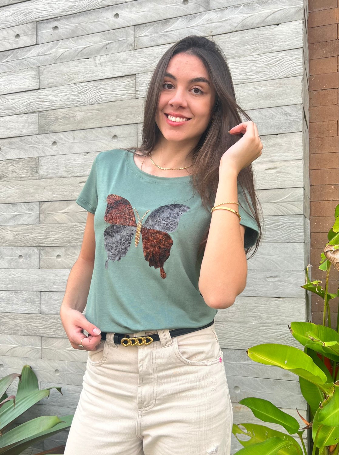 A T-Shirt Isis tem TODO seu trabalhado em pelúcia, bem delicado e com toques de paetês, formando uma única e grande borboleta com um estilo diferenciado e um brilho único, apresenta decote redondo e cor verde!